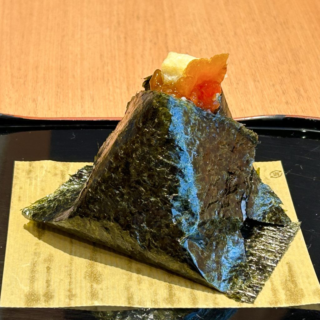 柿のやしい甘さと風味を活かした、とろみあるタレを天ぷらにした堅豆腐に添えて、相性よくしあげてます。地元産の特別栽培米コシヒカリをふっくらむすび、国産海苔で包みました。大人から子供まで楽しめる新食感のおむすびです。