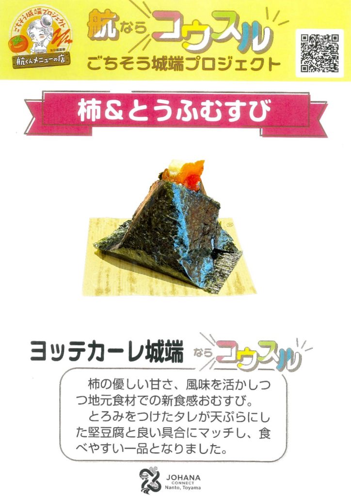 ごちそう城端プロジェクト「航ならコウスル」、航くんメニューの店のひとつ、ヨッテカーレ城端では、12月20(土)より、池田 航さん監修の新メニュー、『柿&とうふむすび』販売開始致しました。